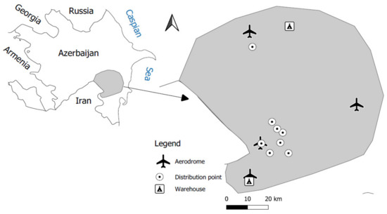 Scheme of the sampling area containing designated warehouses (2 sampling sites), aerodromes (4 sampling sites), and pesticide distribution sites (8 sampling sites).