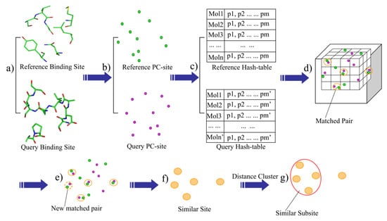 The rules for maching PC points are shown in Table 1. The binding-site matching process is described as follows: Given the hash files of two binding-sites, one is defined as the reference and the other one is defined as the query. (1) One model of the reference hash table is then mapped into the matching box which is a cubic box with grids, and each point of the model is mapped into a grid according to its coordinates (Figure 1d); (2) Map one model of the query hash table into the matching box. If one point from the query hash table matches one point of the reference model in the same grid (the default grid bin width is 1.0 Å) and the PC properties of the two points are also matched, add a vote to the match vote (Figure 1d); (3) If the match vote is lower than the preset threshold (Set A: vote > 6, Set B: vote > 8), go back to step 2. Otherwise, perform the best least-square fit for all of the matched points of the two models. Next, all of the matched pairs that are within the preset distance cutoff (D_cutoff < 3.0 Å) are identified (Figure 1e), thus, the matched pairs are extended. (4) the matched score (M_score) is computed, and all of the matched pairs, which is defined as the similar site, is outputted (Figure 1f); (5) the cluster analysis of the matched points is performed, while the local matched score (L_score) is calculated. The largest family from the cluster analysis is defined as the similar subsite (Figure 1g); and (6) go back to step 2 and perform the next round of matching.