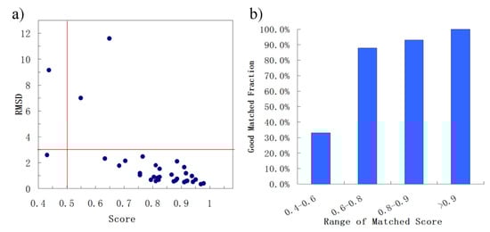 As similarity between the binding sites from proteins with the sequence identity > 19% is generally high, it is easier to match the binding sites and BSMM performance very well in this case. Next, we have tested BSMM with binding sites of protein pairs in Set B, which include 129 complexes pairs, consisting of 77 ligands that are individually complex with proteins in a sequence identity < 14%. Furthermore, the Q-score was calculated to evaluate the structural similarity. The results are listed in Table S2 (Supplementary Materials) and are summarized in Figure 4. Given that good matching should be RMSD < 3.0 Å, the over-all rate of good matching for data set B is 44% (34/77); for Mscore > 0.5, the rate of good matching for data set B is 60% (27/45), and when the Mscore is higher, the rate of good matching is correspondingly higher (Figure 4b). Thus, when BSMM was applied to the pairs with different global folds, the good matching rate was dropped compared to that with similar folds. This was partially caused by that inaccuracy might be induced for the lower fold similarity of the binding site. However, when the Mscore is more than 0.5, the results indicate that BSMM is capable of matching binding sites from proteins with the sequence identity < 14%.