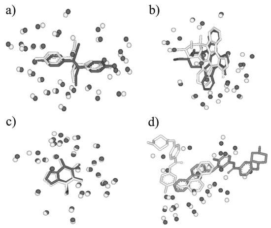 Most current multi-target ligand design is in ligand-based strategy through the combination of selective ligands. In such cases, the designed multi-target ligand usually has a large molecular size and the further optimization of the initial multi-target ligand remains a huge challenge. Target-based strategies—such as using similar binding-sites—might provide another approach for the design of the multi-target ligands. The similar site will be outputted after BSMM matching, which consists of the physicochemical property points of the hydrophobic (ALI, ARO) hydrogen bond (HA, HD, HAD), and may provide rather useful information for the multiple ligands design, such as the pre-filter pharmacophore model before large-scale docking. Two examples are shown here to describe the similar binding site, and the results are shown in Figure 6.