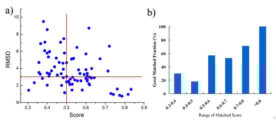 The summary of the matched results of BSMM for data set B: given the good matching should be RMSD < 3 Å, the rate of good matching for data set B is 44%; for Mscore > 0.5, the rate of good matching for data set B is 60%; the rate of good matching does not correlate to the sequence identity when the sequence identity < 12%. (a) the correlation between the ligand RMSD and the the matched score; (b) the good matching rate in different range of matched score.