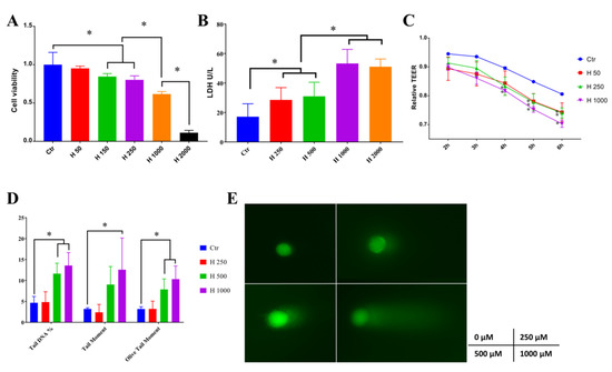 Establishment of a hydrogen peroxide-induced oxidative stress Caco-2 cell model. (A) Hydrogen peroxide significantly decreased cell viability. (B) Hydrogen peroxide above 250 μM significantly increased the lactate dehydrogenase (LDH) leakage from the cell. (C) Transepithelial electrical resistance (TEER) of Caco-2 was significantly decreased by hydrogen peroxide. (D,E) Tail DNA, tail moment, and olive tail moment was significantly unregulated by hydrogen peroxide, which were measured by comet assay (* p < 0.05).