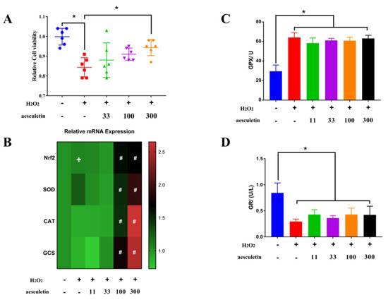 Aesculetin ameliorated decreased cell viability induced by hydrogen peroxide via upregulation of antioxidant related genes. (A) Aesculetin significantly ameliorated the decreased cell viability caused by hydrogen peroxide. (B) H2O2 slightly upregulated the mRNA expression of Nrf2 but 100 and 300 μg/mL aesculetin dramatically increased the gene expressions of Nrf2, superoxide dismutase (SOD), catalase (CAT), and glutamyl cysteine synthetase (GCS) compared to H2O2 treatment. (C,D) H2O2 treatment significantly improved the activity of glutathione peroxidase but suppressed the activity of glutathione reductase. (* p < 0.05, + p < 0.05 vs. control, # p < 0.05 vs. H2O2 treatment).