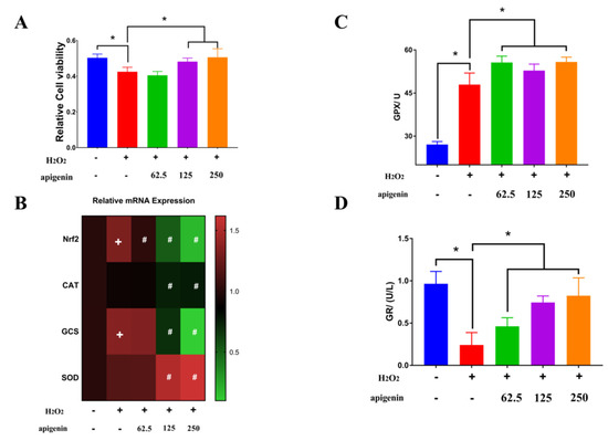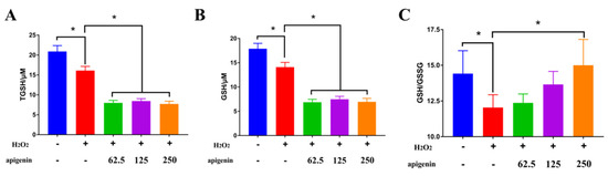 Apigenin is a flavone that exists widely in many fruits and vegetables such as onions, oranges, and tea [24]. Apigenin at 125 and 250 μg/mL significantly ameliorated the decreased cell viability caused by hydrogen peroxide (Figure 4A). In the hydrogen-peroxide-induced oxidative stress model in the MC3T3-E1 mouse osteoblastic cell line, pretreatment of cells with apigenin attenuated the reduced cell viability and upregulated the gene expression of SOD1, SOD2, and GPX [24]. However, apigenin reversed the increased mRNA expression of Nrf2 and GCS caused by H2O2 and decreased the mRNA expression of CAT but enhanced the transcription level of SOD (Figure 4B). SOD catalyzed the dismutation of O2− to H2O2 [25]. Additionally, apigenin further increased the activity of GPX, which was slightly enhanced by H2O2 (Figure 4C). Different changes of GPX and CAT activity were observed in a similar cell model. GPX activity increased with higher H2O2 concentration, while CAT activity remained constant at different H2O2 treatments, which indicated that GPX was more active than CAT in scavenging H2O2 [21]. CAT played an important role as a primary defense enzyme against H2O2 at a low concentration but with a higher concentration of H2O2, GPX worked as a primary defense enzyme against oxidative damage [21]. Moreover, apigenin reversed the decreased activity of GR caused by H2O2 (Figure 4D). GPX and GR are two key enzymes involved in the glutathione (GSH) redox cycle, where GPX uses GSH to reduce organic peroxide and H2O2, and GR reduces glutathione disulfide (GSSG) to GSH in a nicotinamide adenine dinucleotide phosphate (NADPH)-dependent manner [25]. Since GPX and GR activity were increased by apigenin compared to the H2O2 treated group, intracellular GSH level was examined in the following study.