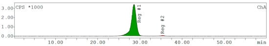 Size Exclusion Chromatography (SEC) profile of [18F]AlF(RESCA)-cAbVCAM1-5 Nb before injection. Retention time (Rt) of [18F]AlF(RESCA)-cAbVCAM1-5 = 28.7 min (99%), free [18F]AlF and [18F]F-Rt = 35.3 min (1%).