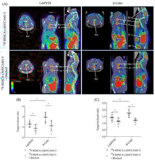 (A) Representative PET/CT images of the same mouse obtained with the LabPET8 (left) or β-CUBE (right) imaging system, demonstrating specific targeting of atherosclerotic lesions in the aortic arch (Ao) of ApoE−/− mice injected with [18F]AlF(RESCA)-cAbVCAM1-5 Nb (upper row), while no uptake is seen at the level of the aortic arch of ApoE−/− mice co-injected with a 90-fold excess of unlabelled cAbVCAM1-5 Nb (blocking condition as control, unlabelled excess injected 15 min before injection of radiolabelled Nb) (lower row). Kidneys (K), bladder (Bl) and bone structures (Bs) are also visible on the images. Target-to-brain (T/B) (B) and target-to-heart (T/H) (C) ratios were calculated to compare the image quality between two commercially available preclinical PET scanners (β-CUBE and LabET8). The number of asterisks in the figures indicates the statistical significance (* P < 0.05).