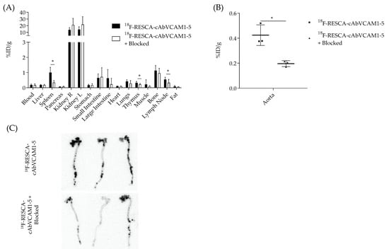 (A) Ex vivo biodistribution profile of [18F]AlF(RESCA)-cAbVCAM1-5 Nb in ApoE−/− mice and ApoE−/− mice co-injected with a 90-fold excess of unlabelled Nb (blocking condition). (B) Ex vivo analysis of excised atherosclerotic aorta, showing significantly higher uptake (2.15 ± 0.06 times; p < 0.03) of the [18F]AlF(RESCA)-cAbVCAM1-5 Nb compared to the control group (blocking condition). (C) Confirmation of the uptake by ex vivo autoradiography. The number of asterisks in the figures indicates the statistical significance (* P < 0.05).