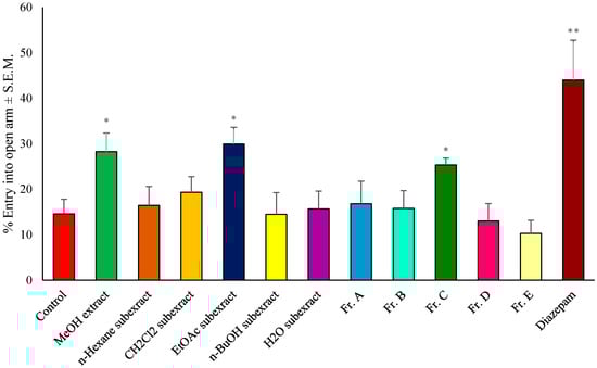 Anxiety behavior in the animal kept in an open area is triggered by two factors: animal left alone in an unfamiliar environment and the fear of wide area called agoraphobia [54]. The open-field test performed for this purpose is one of the most commonly used tests to determine the emotional state of experimental animals before the procedure and any changes that may occur after the procedure [55]. It is also a test used to detect emotions, locomotor activity, and sedation that develop due to anxiety [56]. Locomotor activity is an indicator of mental wakefulness or alertness. Decreased locomotion, which is indicative of calmness and sedation, can be interpreted as reduced CNS excitability [57]. In the present study, the MeOH extract, the EtOAc subextract, and Fr. C obtained from the EtOAc subextract exerted an anxiolytic effect by affecting locomotor activity 30 min after the start of the experiment (Table 2).