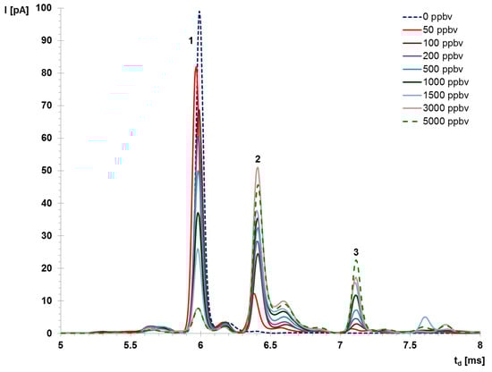 As an example, the IMS spectra obtained in the negative mode are presented in Figure 1 and are clearly highlighting the change in the intensity of the peaks with the increase of the AA measured concentration. When AA vapor concentration increases, the intensity of the negative RIP decreases, while the heights of PIP#1 and PIP#2 increase. The peak observed at a td of ca. 7.6 ms is most probably generated by impurities since it remained relatively constant when the AA concentration changed.