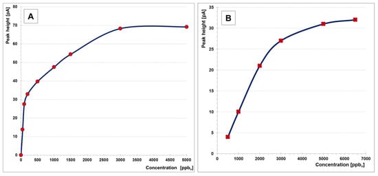 Quantitative data were plotted in order to obtain calibration curves, and finally to evaluate the quantitative response of the ion mobility spectrometer to AA. The calibration graphs are presented in Figure 2A (negative mode) and Figure 2B (positive mode).