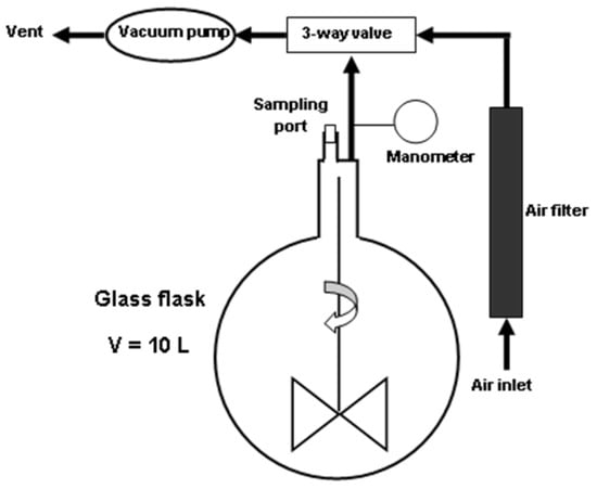 Standard atmospheres with known low concentrations of target analyte were prepared in a custom-built Test Atmosphere Generator (TAG) (see Figure 3), using a static method based on injection of pure liquid AA: the air from a 10 L glass flask was first evacuated using an oil vacuum pump until a low pressure of ca. 150 mm Hg was reached, then a very small volume of pure, liquid chemical was injected into the flask through a PTFE-silicone septum affixed into the sampling port, by using a 1 µL chromatographic syringe. After about 10 s, the syringe needle was removed from the sampling port and air was allowed to fill up the glass flask. A homogenization system based upon a magnetic stirrer that propelled a fan-type piece placed inside the glass flask has been used. In order to avoid the overloading the IMS instrument with the analyte studied, only a volume less than 1 µL of pure, liquid AA was injected into the glass flask; thus, it was ensured low concentrations of AA vapors in the flask, in the low ppmv range.