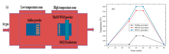 (a) Schematic diagram of MoS2 or WS2 materials growth experiment by atmospheric pressure chemical vapor deposition (APCVD); (b) The temperature change diagram of MoS2 or WS2 materials experiment process by APCVD.
