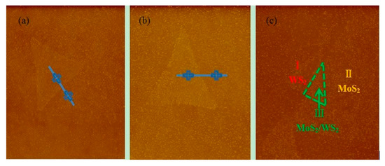 In order to obtain better MoS2/WS2 vertical hetero-junction materials, we first need to grow the high-quality large-area single MoS2 or WS2 materials by APCVD. Under the optimal growth conditions, the gas concentration and nucleation density of single MoS2 or WS2 materials in the tube furnace can achieve the maximum values [20]. The MoS2/WS2 double-layer vertical hetero-junction can be prepared by the two-step APCVD method and the dry transfer processes. At the same time, the MoS2/WS2 vertical hetero-junction samples are systematically characterized by optical microscopy, Raman spectroscopy, PL spectroscopy, AFM and FESEM. In addition, the surface of WS2, MoS2, and MoS2/WS2 vertical hetero-junction samples are all uniform triangles with a size of several tens of microns after the corresponding growth reaction, and the color contrast between the samples and SiO2/Si substrate is relatively obvious, which can be distinguished by the optical microscope, as shown in Figure 2.