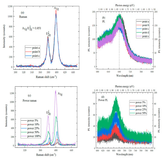 (a) Raman spectrum and (b) Photoluminescence (PL) spectrum of monolayer MoS2 on SiO2/Si substrate at different points; (c) Raman spectrum and (d) PL spectrum of monolayer MoS2 under different laser powers.