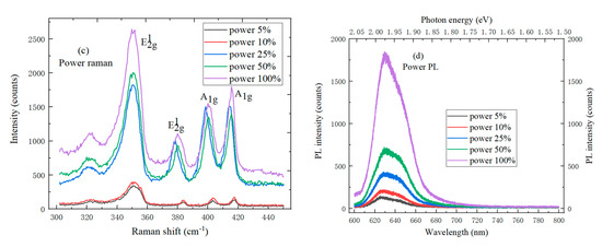 It can be found, by observing Figure 5a, that there are two characteristic peaks in the Raman spectrum of the WS2 sample, and the peak positions of the E12g and A1g characteristic peaks are respectively located at 349 cm−1 and 413 cm−1, which are fitted by the Gaussian function. The peak shift between two characteristic peaks decreases with the layer number decreases, which can be explained by the increase of the Van der Waals force. The Raman spectrums on the triangular WS2 sample remain consistent at different points, which can indicate that the sample is uniform. In Figure 5b, the strongest PL spectrum peak position of monolayer WS2 is located at 636 nm. The band gap of monolayer WS2 is calculated at 1.96 eV from the conversion relationship between the wavelength and electron volt, which is the same as the reported results. Besides, the PL spectrum also has an exciton peak of 2.04 eV. This is because the WS2 sample has energy band splitting [23]. Figure 5c shows the Raman spectrum of monolayer WS2 under the different laser powers. The Raman spectrum shape and relative position of the WS2 sample move, to a certain extent, when the laser power increases. The Raman intensity of the E12g characteristic peak increases with laser power increase, and the E12g characteristic peak shape changes, especially when the laser power exceeds 10%. Meanwhile, the A1g characteristic peak intensity remains constant, but the position has a certain deviation. The PL spectrum intensity of the WS2 sample strongest peak increases with a laser power increase, the strongest peak position is red-shifted, and the shape changes to some extent, as shown in Figure 5d. This phenomenon can be explained from two aspects here; on the one hand, higher power would generate more heat on the WS2 sample, which has an effect on the power PL spectrum of WS2; on the other hand, the SiO2/Si substrate selected in the WS2 growth experiment is an n-type doped semiconductor material [24].