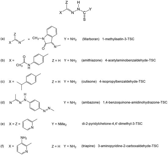 Great interest has been reserved in the last decades to the chemistry of thiosemicarbazones (TSC) of the type X-C(Z)=N-NH-C(=S)Y, where different combinations of X, Y and Z moieties have been introduced in the framework. This allows for the modulation of the lipophilic properties, chelating abilities and steric hindrance, also by the presence of additional functional groups, in order to attain an overall synergistic effect for their desired biological activity as such or that of their metal complexes [,,,,,,,,,,,]. A wide range of medicinal effects of thiosemicarbazones are well known (Chart 1): 1-methylisatin 3-TSC (Marboran, no longer produced as a drug) as being antiviral [], 4-acetylaminobenzaldehyde-TSC (amithiazone, [,]) for the treatment of tuberculosis, 4-isopropylbenzaldehyde-TSC (cutisone []), 1,4-benzoquinone-amidinohydrazone-TSC (ambazone, []), di-2-pyridylketone-4,4′-dimethyl-3-TSC [] and 3-amino pyridine-2-carboxaldehyde-TSC (Triapine, it has undergone Phase I and Phase II clinical trials, [,]) as potential antitumor drugs.