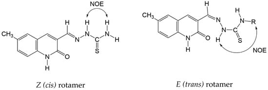 The absence of any ν(S-H) band in the 2700–2500 cm−1 region of the IR spectra excluded the presence of thiol species [] and indicated the thione conformation for the compounds in the solid state. These results are in agreement with the theoretical calculations carried out on similar TSCs [], which have shown that the thione tautomeric forms are stable, even in the presence of a solvent (MeOH). However, recent computational studies on 4-formylpyridine-TSC derivatives proved that both the thiol and thione forms are stable [].
