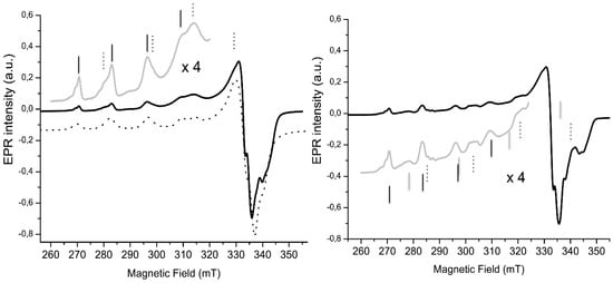 CW-EPR of the samples 1 (left) and 3 (right) in ethanol at 80 K. Black continuous line: experimental spectrum; dotted line: simulated spectrum of 1; grey continuous line: the low-field region expanded to show all the features. The vertical lines mark the position of each quartet due to a different species.