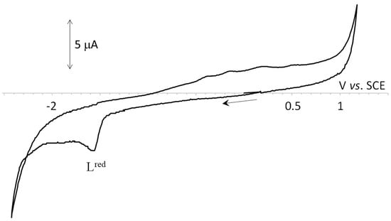 The cyclic voltammetry studies were performed in DMSO/0.2 M [NBu4][BF4] solutions, at ambient temperature, in a three electrode cell and using a 0.5 mm diameter platinum disc working electrode. No oxidation waves were detected for H2L1-H2L3 pro-ligands in the available potential window, but they presented, at a scan rate of 0.2 V·s−1, an irreversible cathodic wave (wave L, Figure 3 and Figure S1 (in the Supplementary Material file); Table 2) at a potential value of −1.56 V vs. SCE (Table 2), which was insensitive to the structural differences (Y moiety, see Chart 1) of the compounds. No anodic processes were detected for H2L1-H2L3 in the available potential window.