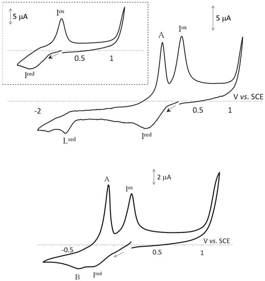 Wave Lred was also detected in the derived Cu(II) complexes 1–3 at the same potential value (Figure 4 and Figure S2), therefore suggesting that the redox process was located far off from the influence of the metal center. In addition, the Cu(II) compounds presented, at the scan rate of 200 mV·s−1, a broad reduction wave (wave Ired, Figure 4, top; Figure S2) between −0.26 and −0.32 V vs. SCE (Table 2), which was believed to involve the overlapped stepwise CuII→CuI and CuI→Cu0 reductions. Although at 0.2 V.s−1 the two cathodic processes were undifferentiated, they became evidently separated at lower scan rates (Figure 4, bottom), and a novel wave, B, (Figure 4, bottom) was detected at potentials of ca. −0.40 V vs. SCE.