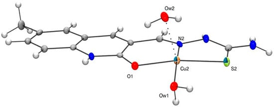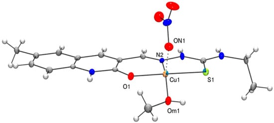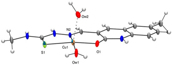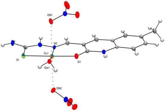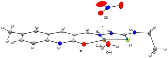 The presence of two NO3− counterions unambiguously defines the metal oxidation state. The immediate coordination sphere consisted of the N, O, S atoms of the TSC ligand and the O atom of a water molecule (Cu-Ow1 1.928(3) Å); these ligands define a square planar geometry (Supplementary Materials, Table S7). A second clathrated H2O molecule (Cu-Ow2 2.226(4) Å) in an apical position resulted in a pseudo square-pyramidal environment. The Cu–ligand bond distances and angles are in the expected range and comparable with those of related structures [].