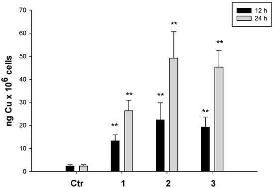 Cellular uptake in cancer cells. A375 cancer cells were incubated with 2 µM of copper complexes for 12 or 24 h, and the cellular copper content was detected by a GF-AAS analysis. Error bars indicate the standard deviation. ** p < 0.01.