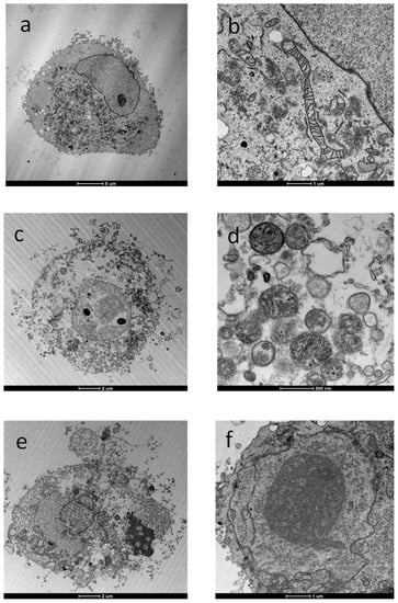 Finally, in order to characterize the cellular morphological changes induced by the new Cu(II) TSC compounds, we observed treated A375 cancer cells using transmission electron microscopy (TEM), a valuable tool for investigating cells and their alterations at the ultrastructural level. Figure 12 shows representative TEM images of A375 cells after incubation for 48 h with IC50 doses of 2 and 3. Cells treated with copper-TSC derivatives exhibited the characteristic ultrastructural features of apoptosis, such as cell shrinkage, chromatin condensation and formation of apoptotic bodies (Figure 12c–f with a,b control cells). However, mitochondria appeared to be quite conserved in terms of shape and internal structures, with minimal evidence of swelling features (increase in size and decrease in turbidity).
