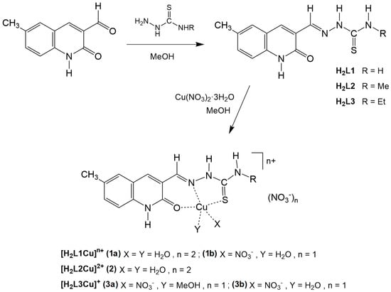 H2L1, H2L2 and H2L3 have been prepared according to the procedure previously reported in the literature (Scheme 1) [,,,] by condensation of 6-methyl-2-oxo-1,2-dihydroquinoline-3-carbaldehyde [] with the corresponding thiosemicarbazides in hot methanol. The compounds were obtained in high yields as yellow powders.