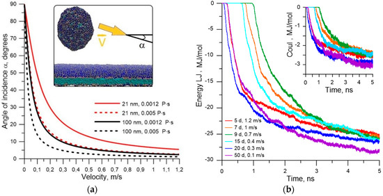 where d is the particle diameter, η is the coefficient of the medium viscosity, t is the time during which the particle is displaced, kB is the Boltzmann constant, and T is the absolute value of the medium temperature. From the relationship between velocity of displacement of the liposome to the membrane and velocity of blood flow along the membrane, one can obtain the distribution of incidence angles of the liposome on the cell membrane. Figure 5a shows the calculated distributions for liposomes with diameters of 21 and 100 nm at T = 310 K and viscosity values of 0.0012 Pa·s and 0.005 Pa·s [52]. As is known, the wall layer of blood flow has a lower viscosity, since this part of the flow is plasma. The velocities vary from a minimum value of 0.01 m/s [53], as in the capillaries, to a maximum value of 1.2 m/s [54], as in the large aorta. As can be seen from the plots in Figure 5a, the incidence angle of liposomes α lies in the range 0 < α < 15° for the most typical velocity range of 0.5–1.2 m/s (this velocity range is typical for the majority of middle and large vessels). Both small-diameter (21 nm) liposomes and liposomes with a diameter of 100 nm fit into this range. Since the wall layer of blood flow is represented by plasma, it is possible to consider water as the environment during the modeling of the contact of the liposome with the endothelial cell membrane. The viscosity coefficient of the water (0.0012 Pa·s) is close to the plasma viscosity.