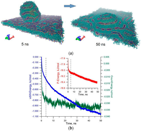 Snapshots in Figure 6a clearly demonstrate a dramatic change in the distribution of the polar heads of the phospholipids of the liposome and membrane when they are spliced. Before contact with the bilayer surface, the distribution of the hydrophobic part of the bilayer is almost ideal. When the liposome makes contact with the membrane, the distribution of the hydrophobic part changes sharply already in the first nanoseconds (snapshot of 5 ns). In subsequent tens of nanoseconds, the membrane surface looks disturbed (snapshot of 50 ns). This is due to the natural reaction of the equilibrium structure of the membrane to external action from the liposome. Gradually, the membrane response is smoothed, which is well illustrated by the plots in Figure 6b. The dotted line indicates the moment of contact of the liposome with the membrane. Up to this moment, the liposome was attracted by the membrane, as evidenced by a reduction in the van der Waals energy. Furthermore, the electrostatic attraction is also observed. Then, there is a long period of relaxation of the liposome–membrane complex. This period is accompanied by a reduction in the potential energy and energy of the van der Waals interaction. During this period, the liposome is almost immersed in the membrane layer, so the van der Waals energy and potential energy decrease. This suggests that the splicing of the liposome with the membrane is advantageous in energy.