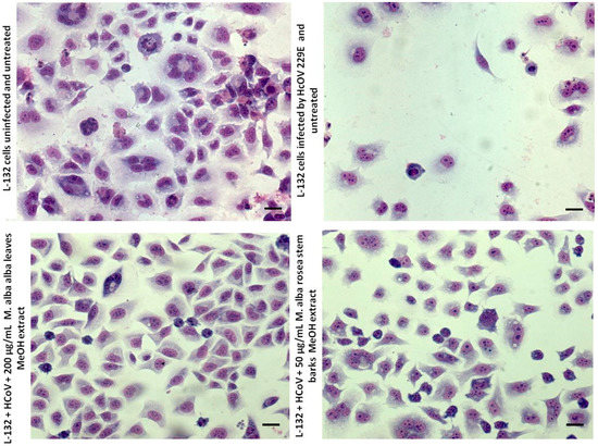 Human coronavirus (HCoV) 229E cytopathogenic effects observed with hydromethanolic extracts of Morus alba var. alba leaves and Morus alba var. rosea stem barks. Scale bar, 20 µm.