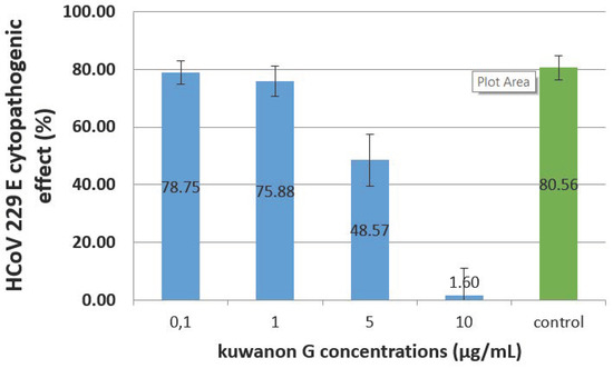 Prior to the antiviral tests, the cytotoxicity of kuwanon G was evaluated as described in 4.4.1. The tested concentrations ranged from 0 to 20 µg/mL. The results were calculated after 3 independent experiments, and 4 replicates for each concentration were tested. The cells were then incubated for 24 h at 37 °C. On the day of infection, dilutions of kuwanon G (Biosynth® carbosynth, CAS No 75629-19-5) from 0.1 to 10 µg/mL were prepared in the culture medium, containing 2% of FBS. These concentrations have been chosen according to the kuwanon G cytotoxicity assay. Cascade dilutions of the HCoV 229E virus were prepared for each kuwanon G dilution in order to test the virus at a multiplicity of infections (MOIs) equal at 1, 0.1, and 0.01, and wells were incubated with the virus/kuwanon G mix. Each test was reproduced in 8 identical wells. The plates were incubated for 72 h at 33 °C. The analysis of the wells was performed by microscopic observation of the cytopathogenic effect of HCoV 229E in the presence and absence of kuwanon G and after staining of the cell monolayers with crystal violet, as previously described.