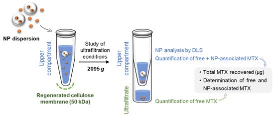 Therefore, as the selection of filter pore size relies on the size of nanoparticles, a 50 kDa pore size was used, enabling the passage of compounds up to 2.4 nm (free MTX < 1 nm) []. The possible interaction with filtering materials requires careful studies since it depends on the properties of the drug, properties of the filtering material, and also on the assay conditions. Indeed, drug-filter interactions could result in drug precipitation inside the filter pores, causing overestimated results when the encapsulation efficiency is determined solely based on the concentration of free drug in the permeate.