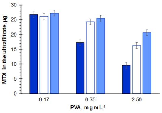 Despite the low interaction of the filter material, PVA markedly affected MTX permeation, with decreasing volumes (and consequent decreasing of MTX amounts) present in the ultrafiltrate after 5 min of centrifugation for increasing PVA quantities (Figure 2, Table S1). In fact, whereas for 0.17 mg mL−1 of PVA, 92% of the loaded volume permeated the filter after 5 min of centrifugation, for PVA concentrations of 0.75 and 2.5 mg mL−1, the permeation volume decreased to 62% and 35% of the initial volume, respectively. The increase in ultrafiltration time to 15 min was still insufficient for MTX ultrafiltration when 2.5 mg mL−1 of PVA were present (passage of 73% ± 3% of loaded volume).