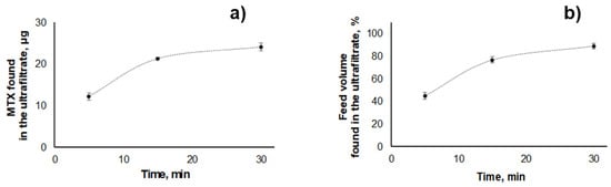 Effect of ultrafiltration time in the (a) MTX mass (µg), and (b) percentage of feed volume transferred to the ultrafiltrate compartment when blank NLCs (26 mg mL−1) spiked with 13.9 µg mL−1 MTX were submitted to ultrafiltration (2095× g).