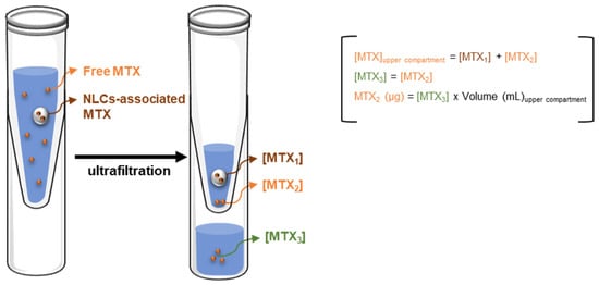 To address this issue, the quantity of MTX associated to nanoparticles was determined as the difference between the total and the free MTX found in the upper compartment (Figure 4, Table 2). Moreover, the determination of free MTX in the upper compartment was performed assuming that the concentration of free MTX in the upper compartment is equal to the concentration found in the ultrafiltrate (which contains only free MTX), and assuming also that no MTX-filter interactions occur (Figure 4).