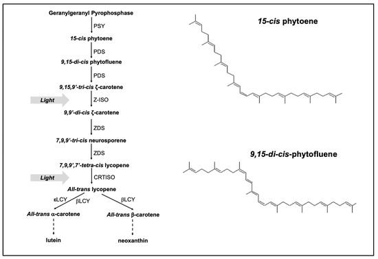A generally acknowledged biosynthetic pathway of carotenoids in plants and algae [8,9,10]. PSY, phytoene synthase; PDS, phytoene desaturase; Z-ISO, ζ-carotene isomerase; ZDS, ζ-carotene desaturase; CRTISO, carotenoid isomerase; εLCY, lycopene ε-cyclase; βLCY, lycopene β-cyclase; Chemical structures of 15-cis phytoene and 9,15-di-cis-phytofluene (ACD/ChemSketch Software) are also shown in the figure.