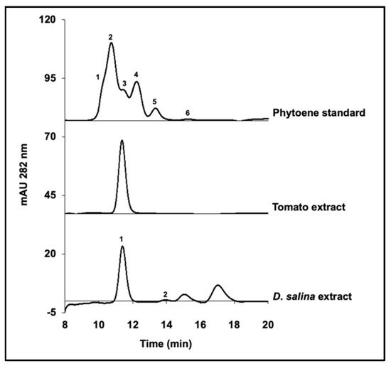 Sample Availability: Samples of tomato fruits and phytoene standard are available from the authors. Dunaliella salina strain CCAP 19/41 (PLY DF15) was obtained from the Marine Biological Association, UK. |