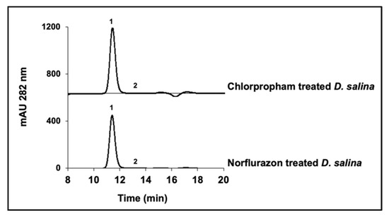 HPLC chromatograms of phytoene extracts from D. salina cultures treated with 20 µM of chlorpropham or 5 µM of norflurazon, only showing the region of interest in the chromatogram.