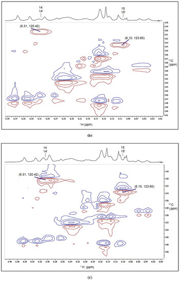 1H–13C-NMR spectra displayed as heteronuclear single quantum correlation spectra (HSQC) to show the chemical shifts values (ppm) for the carbon atoms C14, C15, C15′ and C14′ of phytoene extracted from (a) tomato, (b) chlorpropham and (c) norflurazon treated D. salina extracts. Numbers above the 1H-NMR spectra indicate the carbon number of phytoene associated with the resonance.