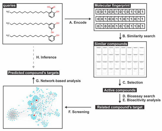 Figure 1. Schematic framework of this study. (A,B) Active compounds are translated into a molecular fingerprint format (binary code) as a template for the similarity search of the database based on a similar coefficient. (C–E) Among similar compounds, only the active molecules are chosen and searched for their targets using the Bioassay and Bioactivity databases. (F,G) The related compound’s targets are screened by the DENV-human interactome network (DenvInt) [41] and scored using the network-based analysis method. Finally, (H) the DENV-host related targets of active similar compounds are annotated and identified for their potential function using several databases.