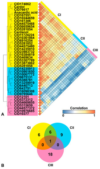 Figure 2. (A) Three clusters of phenolic lipids and active similar compounds; CI, CII, and CIII, represented as a hierarchical dendrogram (yellow, blue, and pink). The similarity score of these compounds is illustrated as a heatmap correlation that ranged from 0 (blue) to 1 (orange). (B) The overlap of targets from the bioassay database for the 37 active similar compounds. Only one target was a common protein of all similar compounds.