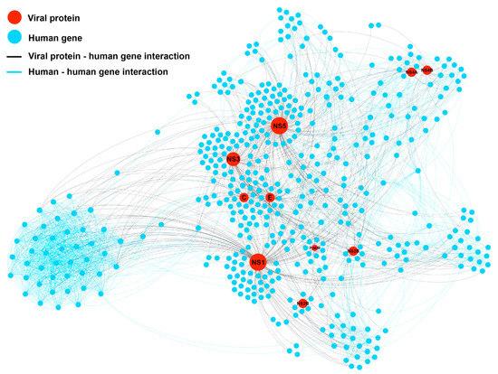 By combining the DENV proteins from the DENV-human interactome (DenvInt) database and human proteins from the STRING protein-protein interaction (PPI) database, the extended DENV-human interaction network (DenvIntS) was constructed, as shown in Figure 3. This network consisted of 478 human proteins and 10 dengue proteins (C, E, NS1, NS2A, NS2B, NS3, NS4A, NS4B, NS5, and PrM/M). The whole network followed the power-law distribution and the properties of the network are represented in Table 2. The centrality scores calculated from each node in this network are shown in Supplementary Tables S1 and S2. The average degree of connections of the DENV proteins interacting with the human proteins was 67.6, which was much higher than the average degree of the whole network. This indicated that the viral proteins intervene in the human proteins to survive and maintain their life as expected. A comparison of the average node properties between the human and the DENV protein nodes is shown in Table 3. All centrality measures (degree, eigencentrality, BC, and closeness centrality (CC)) demonstrated higher values in the DENV protein nodes. The dengue proteins showed a hub property since they had high degree but low clustering coefficient in average. Their neighboring proteins were not much connected as the average value of the clustering coefficients was quite low compared to those of the all protein in the network and also to those of the only human proteins. Interestingly, the number of involved triangles for the DENV proteins was much higher than the others, which suggests that most of the human proteins that connected to the DENV proteins were also connected to other proteins as well as to their own proteins.