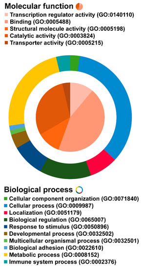 Figure 6. Gene oncology (GO) of the predicted targets and the other human proteins. Molecular function and biological process are represented as a pie and doughnut diagram.