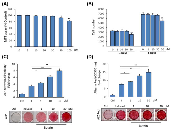 We examined the cytotoxicity of butein on primary cultures of mBMSCs. The effect of different concentrations of butein on cell viability of mBMSCs was measured using an MTT assay. Shown in Figure 1A, butein displayed toxicity on cell viability at concentrations above 30 µM. Similarly, a cell proliferation assay revealed the inhibitory effect of butein on the cell proliferation of mBMSCs at concentrations above 30 µM, as assessed by counting cell numbers after 3 and 6 days in culture. Thus, we used butein at concentrations between 1–30 µM throughout this study (Figure 1B).