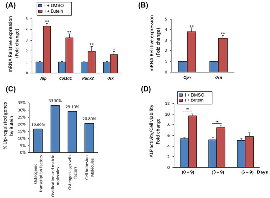 Butein stimulates the upregulation of osteoblast-related gene expression. (A) Butein upregulated the gene expression of early and (B) late osteogenic markers in mBMSCs during osteogenesis. Cells were induced to osteoblast differentiation for 12 days in the absence (I + DMSO) or the presence of butein (I + butein, 30 µM). Expression of each target gene was normalization to the reference genes and represented as a fold change over differentiated cells without butein. (C) Upregulated osteoblast-related genes by butein in mBMSCs as measured by qPCR-based osteogenic gene array analysis. Upregulated genes by butein were categorized according to their osteogenic functions. (D) Treatment of mBMSCs with butein at different stages during osteoblast differentiation. Cells were induced to differentiate into osteoblasts and then treated with DMSO (I + DMSO) or butein (30 µM) at day1, day3 and day6 of osteogenesis. ALP activity staining was performed after 9 days for all treatments. Values are mean ± SD of three independent experiments, (* p < 0.05, ** p < 0.005 compared to differentiated cells without butein).