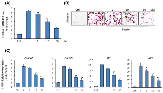 Since osteoblasts and adipocytes in bone marrow are originated from the same precursor BMSCs [39], we examined the effect of butein on adipocyte differentiation of mBMSCs. Butein was shown to inhibit the commitment of mBMSCs into adipocytic cell lineage in a dose-dependent manner, as assessed by Oil Red O quantification and staining for lipid accumulation (Figure 3A,B). Further, butein down-regulated the mRNA expression of both early (Pparγ2 and C/ebpα) and late (aP2, and Lpl) adipogenic markers in mBMSCs, as measured by qPCR analysis (Figure 3C).