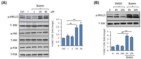 Butein-induced osteogenesis is mediated by activation of ERK1/2 phosphorylation. (A) Western blot analysis of MAPK protein expression (Total and phospho-activating extracellular signal-regulated kinase, T-ERK2 and p-ERK1/2; Total and phospho-Jun N-terminal kinase, T-JNK and p-JNK; and total and phospho-P38, T-P38 and p-P38), in mBMSCs treated with different concentrations of butein (1–30 µM). Cells were induced with an osteogenic cocktail (as described in the Materials and Methods) in the absence of non-induced or in the presence of butein for 2 h. (B) Western blot analysis of the activation of ERK1/2 phosphorylation by butein in mBMSCs during osteogenesis. Cells were induced with an osteogenic cocktail in the absence or the presence of butein (30 µM) at 6 h and 24 h. Intensity for pERK1/2 was normalized to total ERK and represented as a fold change over control cells. Values are mean ± SD of three independent experiments, (** p < 0.005 compared to cells without butein).