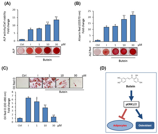 Butein stimulates osteogenesis and inhibits adipogenesis in human (h) BMSCs. (A) Dose-dependent stimulatory effect of butein on osteoblast differentiation of hBMSCs as measured by quantification of ALP activity and (B) quantification using Alizarin Red staining for matrix mineralization. Images for staining were presented. (C) Dose-dependent inhibitory effect of butein on adipocyte differentiation of hBMSCs as assessed by Oil Red O staining quantification. Staining images were presented. (D) Schematic diagram demonstrates the stimulatory effect (arrow) of butein on osteogenesis and the inhibitory effect (blunted arrow) of butein on adipogenesis of BMSCs via activating ERK1/2 signaling. Values are mean ± SD of three independent experiments, (* p < 0.05, ** p < 0.005 compared to differentiated cells without butein).