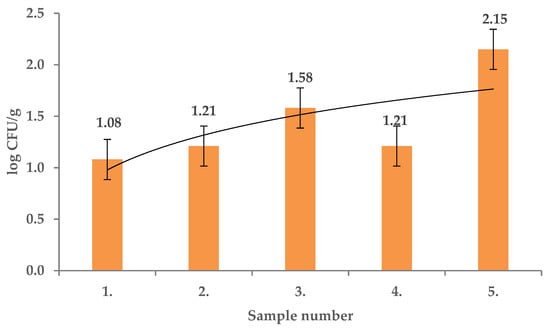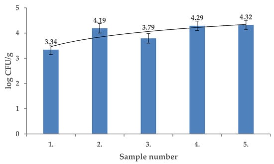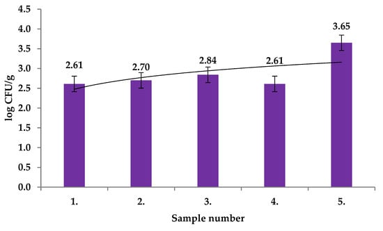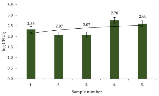Microscopic fungi counts in the present study ranged from 2.07 ± 0.06 log CFU/g to 2.59 ± 0.13 log CFU/g (Figure 6) and significant differences between the samples were identified (p < 0.01). The presence of Mucor circinelloides, Mucor ramosissimus, Epicoccum nigrum, Phoma glomerata, Phoma sorghina, Trichoderma koningii, Penicillium citrinum, Alternaria alternata, Aspergillus versicolor, and Cladosporium spp. was confirmed using MALDI TOF MS.